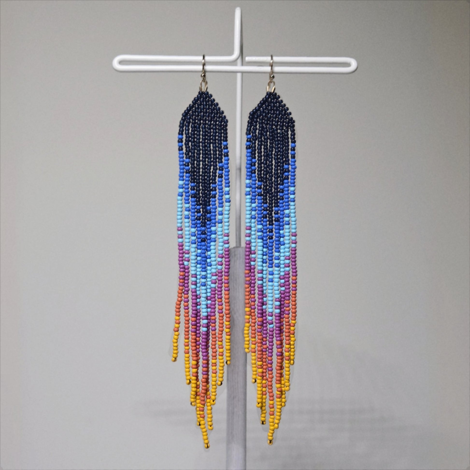15cm sunset gradient fringe earrings made by Sabrina Moshenko (Cree and Métis).