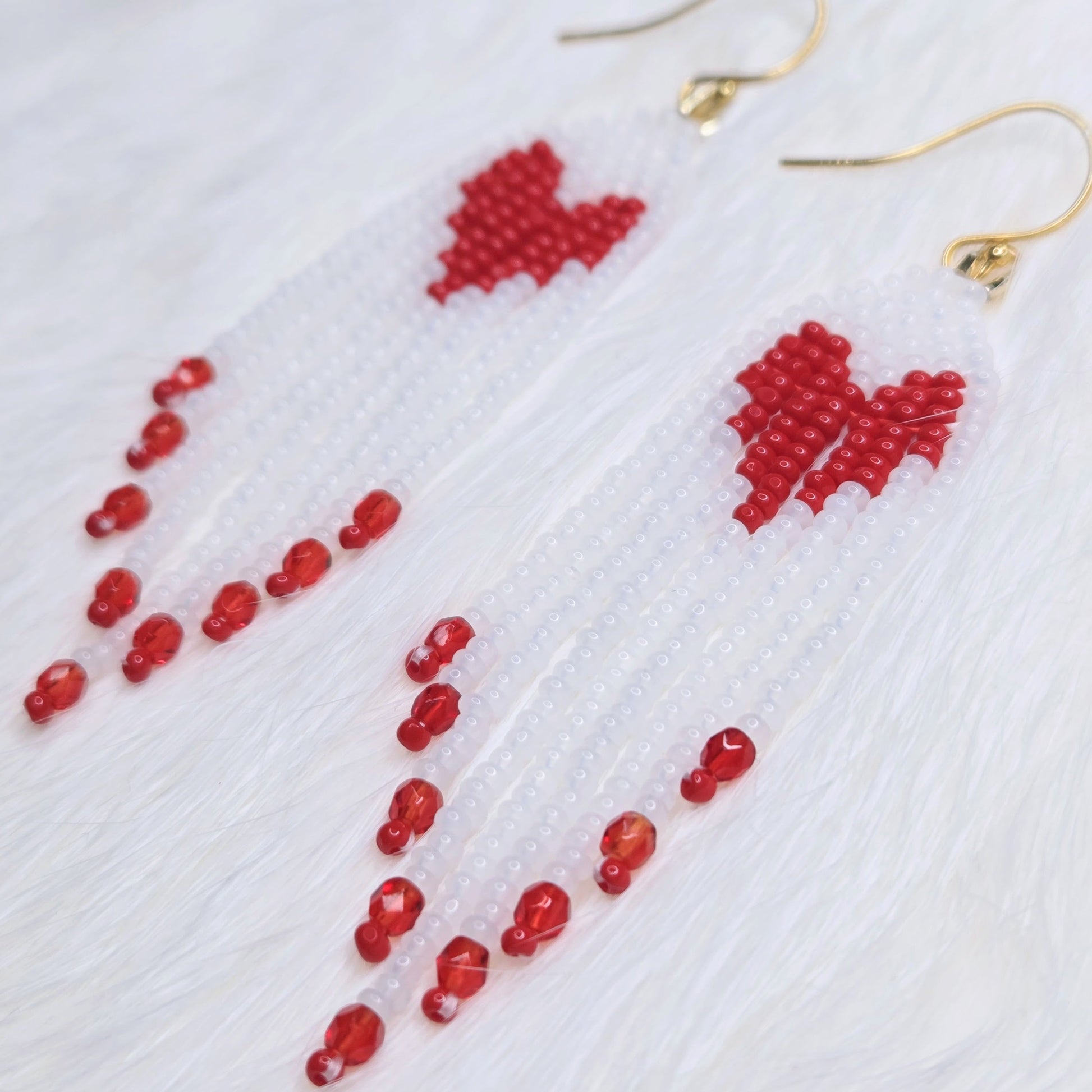 Beaded with size 11/0 rocaille and charlotte cut beads with 3mm red faceted glass bead detailing. These earrings are set on 14k gold filled hooks.