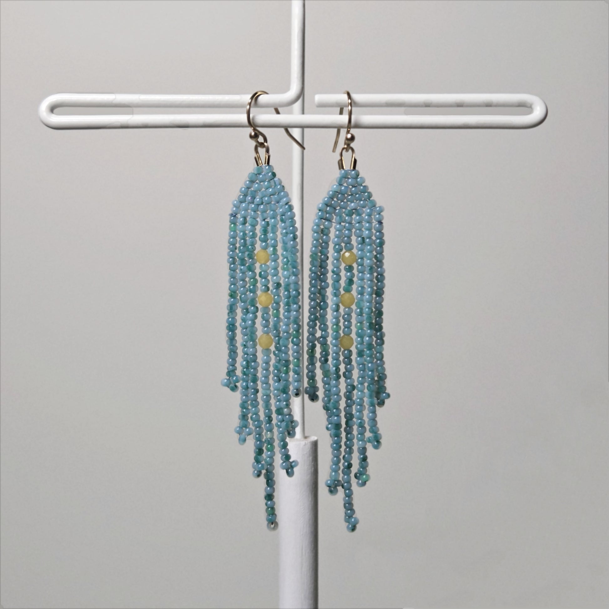 Beaded with size 11/0 charlotte cut beads with 3mm yellow faceted glass bead detailing. These earrings are set on 14k gold filled hooks.