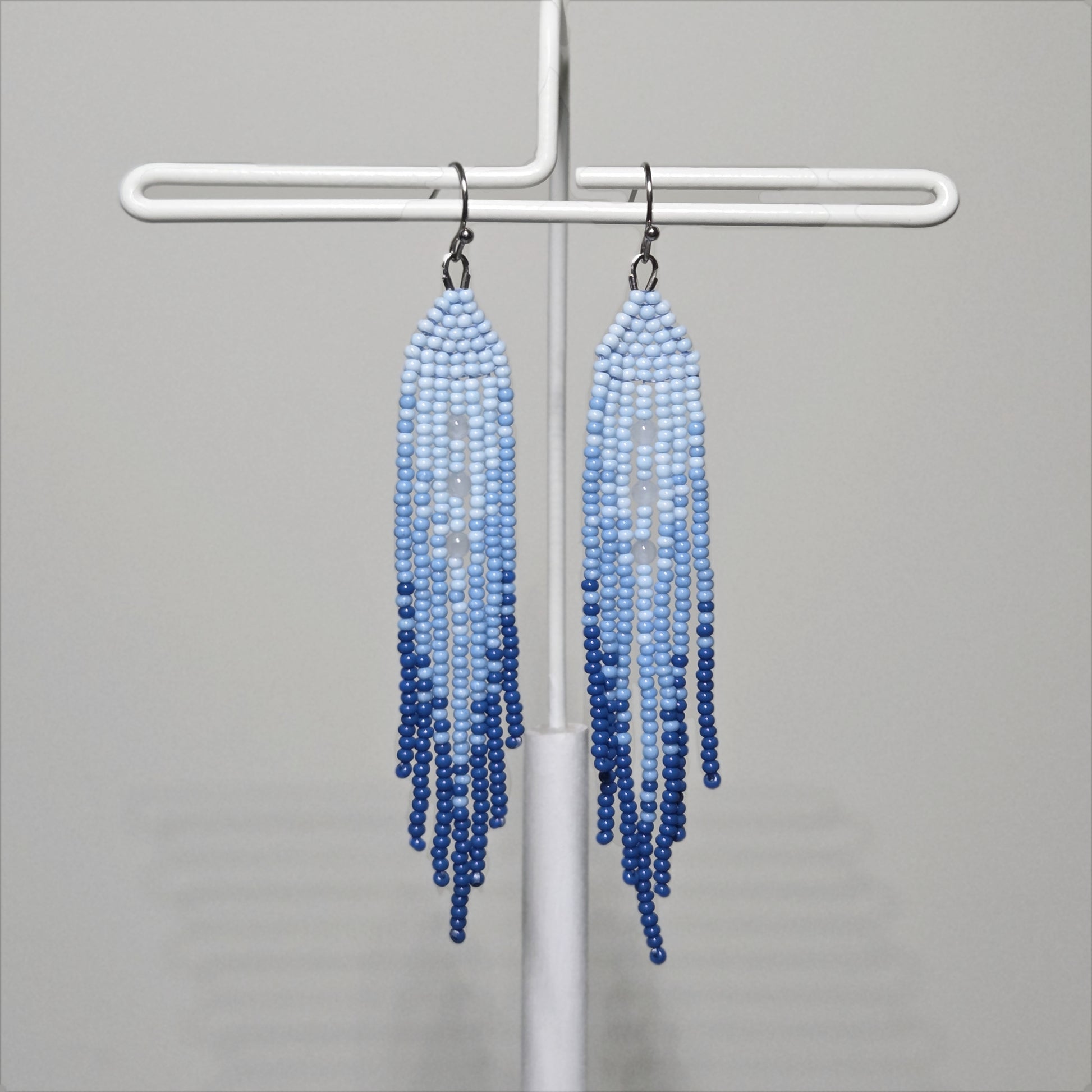 Beaded with size 11/0 seed beads with 3mm translucent glass bead detailing. These earrings are set on stainless steel hooks.