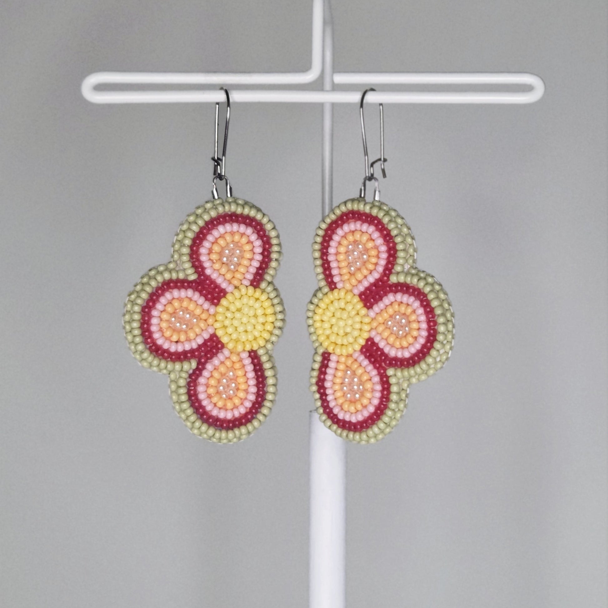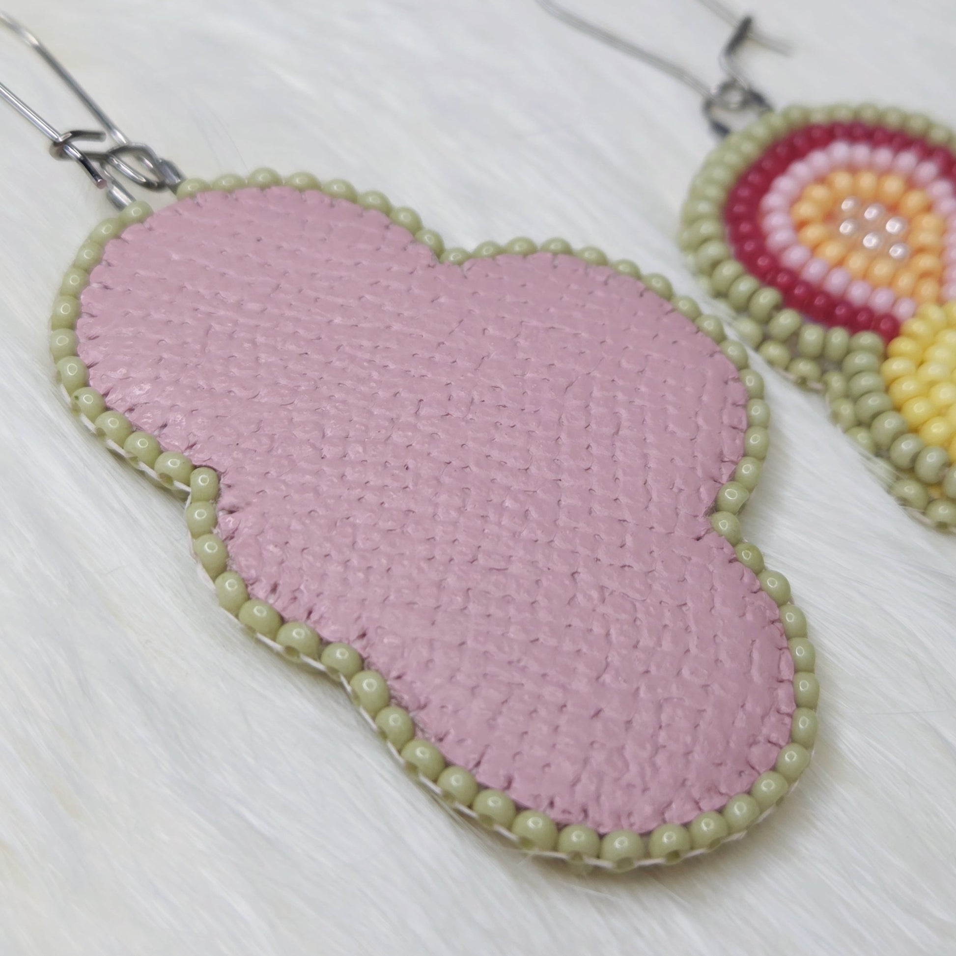 Beaded with size 11/0 beads. These earrings are backed with pink faux leather and set on stainless steel hooks.